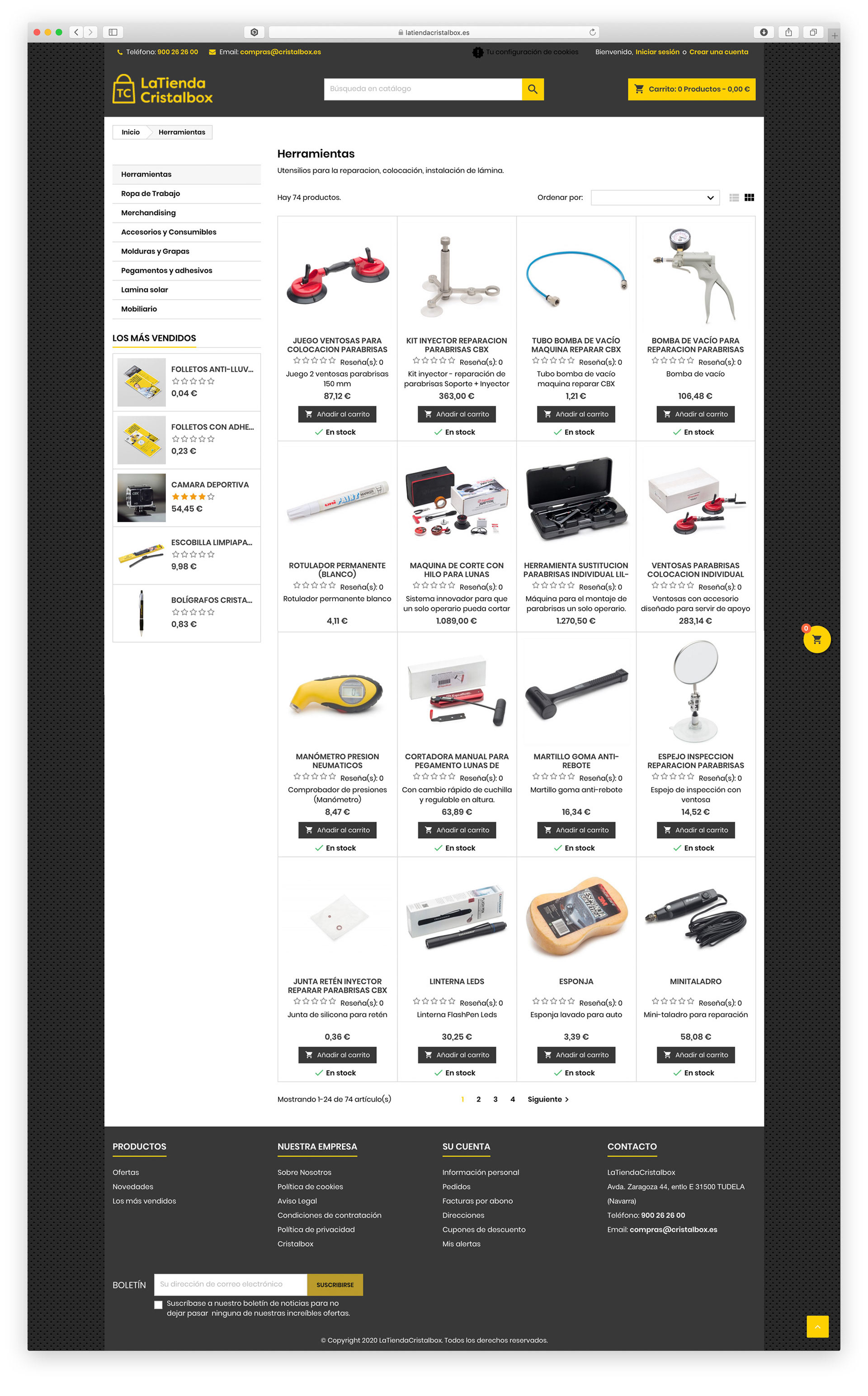 Proyecto realizado con Prestashop y conectado al sistema de gestión Navision. Cristalbox es la mayor red nacional de centros de reparación y sustitución de lunas del automóvil.